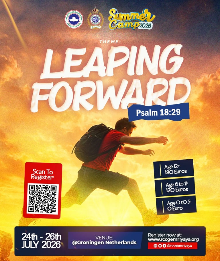 RCCG Europe Mainland Region 1, Young Adult and Youth Affair: presents Summer Camp 2026: LEAPING FORWARD. Based on Psalm 18:29, this camp is designed to empower you to scale new heights and overcome every wall in your path.